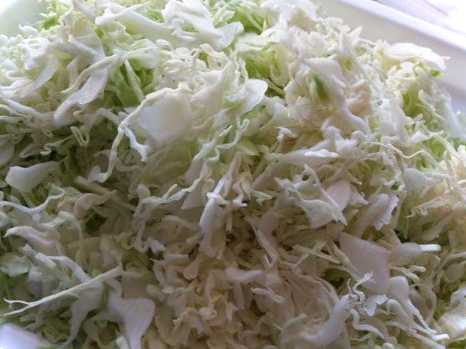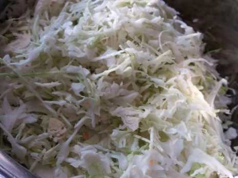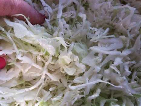 Після того, як капусту нашаткували, складаємо її в зручну каструлю, в якій потім все далі робитимемо. Виберіть більше каструлю, щоб там було зручно перемішувати всі інгредієнти.