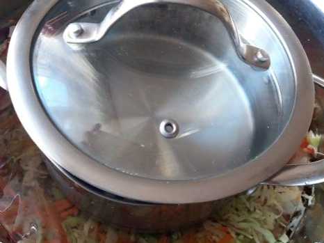 Крок 7. Після того, як добре перемішали капусту, ставимо її під гніт. Накриваємо овочі плоскою тарілкою і ставимо на неї щось важке: каструлю або банку з водою. Забираємо каструлю у прохолодне місце (у холодильник) на 3 години. Якщо залишите при кімнатній температурі, достатньо буде і 2 години, щоб страва була вже готова для вживання.