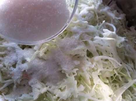 Крок 2. Потім капусту потрібно буде перетерти з цукром та сіллю. Висипаємо сіль та цукор у каструлю