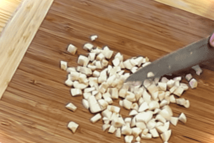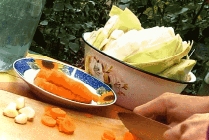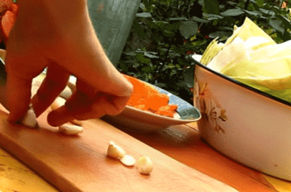 Зняте верхнє капустяне листя не викидаємо, воно ще знадобиться.Часник крупно нарізаємо, тому що в такому вигляді він краще віддає аромату.