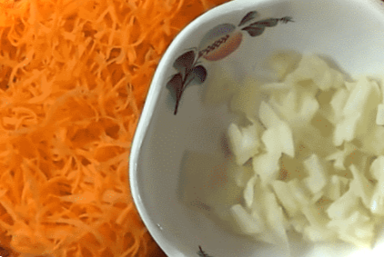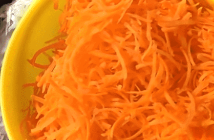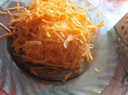 Моркву трьом на великій тертці і також додаємо до нарізаних овочів.