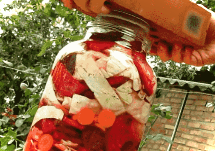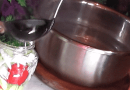 Розсіл розмішуємо та гарячим заливаємо овочі.