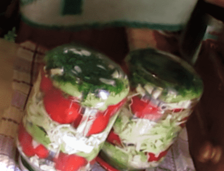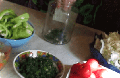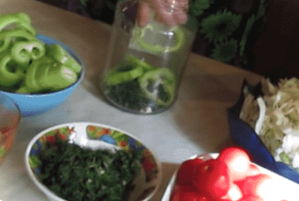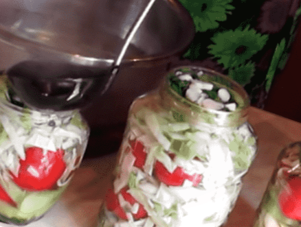 Потім йдуть шар помідорів, потім шар капусти. І так повторюємо у тій самій послідовності, поки банку повністю не заповниться. Заливаємо вміст банок окропом і залишаємо на 5-10 хвилин, щоб овочі прогрілися.