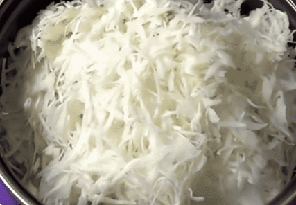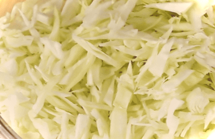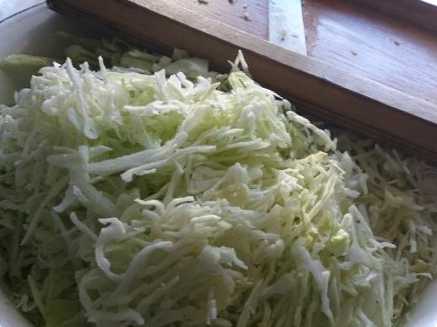 Спочатку готуємо овочі: очищаємо і шаткуємо капусту тонкою соломкою.
