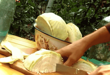 Качан спочатку розрізаємо навпіл, а потім кожну половинку ще на 5-6 частин.