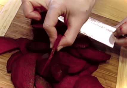 Буряк очищаємо від шкірки, розрізаємо навпіл, а потім на півкільця завтовшки не більше 0,5 см.