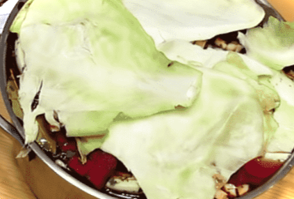 У великій каструлі шарами укладаємо овочі. Спочатку укладаємо половину капусти.