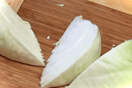 З капусти знімаємо верхнє листя. Качан розрізаємо на 8 частин по качанку, тобто скачала розрізаємо навпіл від качанця вниз, потім кожну половинку ще навпіл і ще раз наполовину. Розрізати потрібно так, щоб на кожній частині залишився шмат качан, це необхідно для того, щоб листя не розвалилося. Зайву частину качан можна зрізати, вона не знадобиться.