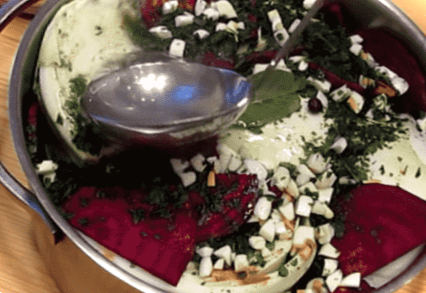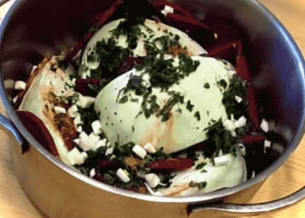 Подавати капусту можна великими шматками чи порізати на дрібні квадратики. З неї можна зробити салат, заправивши цибулею та олією. Скибочки буряка зазвичай не їдять, вони використовуються тільки для кольору та смаку. Але хтось і такий гостренький буряк люблять, за бажання його теж можна покласти на тарілку.