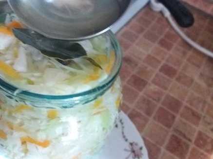 Після закипання воду повторно заливаємо у банки, залишаємо на 10 хвилин. Другий раз зливаємо воду зі банок і знову ставимо кип'ятитися цю воду, але вже туди додаємо сіль, цукор, оцет та спеції – перець, гвоздику, лавровий лист. Доводимо до кипіння і одразу ж заливаємо капусту маринадом.