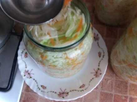 Через різкі коливання погоди у мене потріскалася рання капуста. Ну шкода ж її викидати, от я й вирішила замаринувати її, причому одразу на зиму. Знайшла в інтернеті такий рецепт і вирішила спробувати. З одного качана у мене вийшло 3 літрові банки. Дві з них закрила під залізні кришки, одну залишила на пробу. Заготівля вийшла смачна, в міру гостра і трохи хрумка. Хоча при приготуванні за цим способом я сумнівалася, що вона буде хрумкою.