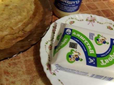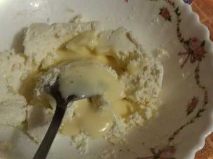 На 100 г сиру я взяла 2 чайні ложки молока, що згущує|згущає|. Цієї кількості молока цілком буде достатньо, тому що якщо взяти більше, то вийде дуже рідкий сир і такий млинець не зручно буде їсти.