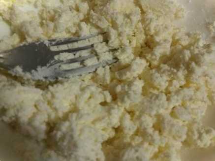 Сир спочатку краще протерти через сито, або перебити занурювальним блендером, або просто ретельно розім'яти вилкою до однорідного стану. Я робила виделкою, тому що занурювальним блендером дуже важко подрібнити сир, тому що ніж забивається сиром і зі своєю функцією справляється погано.