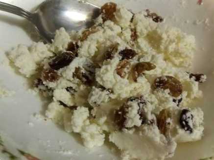 Пропорції: на 100 г сиру беруть жменю родзинок. Ванілін додають за бажанням.