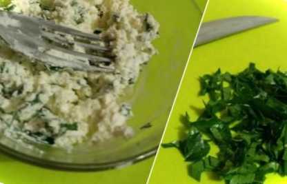 Зелень попередньо обов'язково промийте під проточною водою, а потім обсушіть на паперовому рушнику, щоб на зелені не залишилося вологи. Потім листочки дрібно поріжте, і додайте до подрібненого сиру.