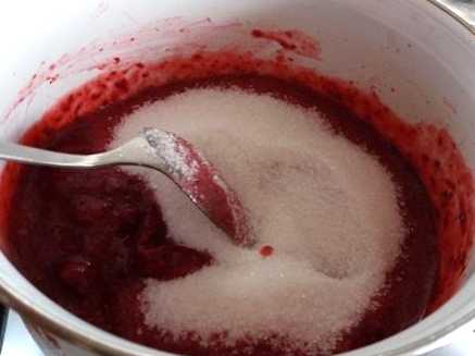 Ставимо каструлю на середній вогонь, додаємо до ягідної маси цукор, перемішуємо.