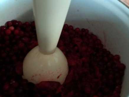 Розтанули ягоди висипаємо в каструлю, подрібнюємо їх за допомогою блендера. Якщо в господарстві немає такого приладу, можна подрібнити товкачем для приготування картопляного пюре або придушити просто виделкою. Можна взагалі обійтися без подрібнення ягід, але мені більше подобається однорідна консистенція підливи, і це красивіше виглядає у блюді.