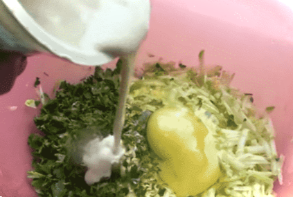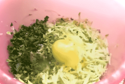Додаємо до овочевої маси яйце та зелень, перемішуємо,