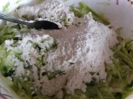 Відставте тісто убік ненадовго. Кабачок дасть сік, і тісто виявиться трохи рідше, тому борошно при замісі тіста не шкодуйте.