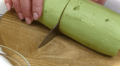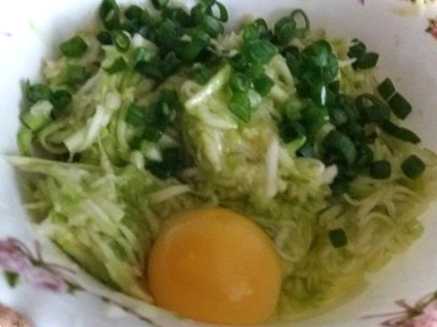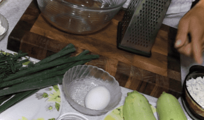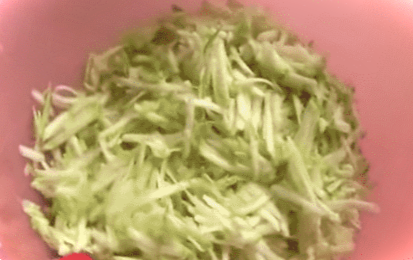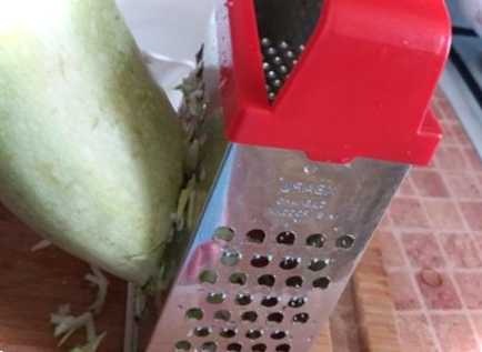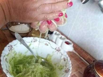 Кабачки миємо водою, відрізаємо у них кінчики. Якщо овоч переріс, очищаємо його від шкірки та від насіння. У молодих невеликих екземплярів шкірку можна не чистити. Натираємо його на тертці з великими отворами, трохи солимо і відставляємо на кілька хвилин.