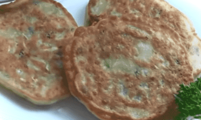 Це дуже смачні оладки з часниково-сирним смаком та великою кількістю зелені. Готуються також дуже швидко. В результаті реакції кефіру та соди тісто піднімається, що і надає пишність виробу під час смаження.