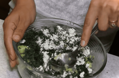 Віджату від вологи, овочеву масу складають у блюдо, туди ж додають нарізану зелень та цибулю. Потім додають сир. Усі перемішують, щоб вийшла однорідна маса.