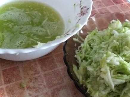 У кабачків виділився сік, віджимаємо його, щоб вийшла зайва рідина. Якщо сік не прибрати, то оладки вийдуть рідкими і не триматимуть форму. Об'єм овочів при цьому зменшиться значно.