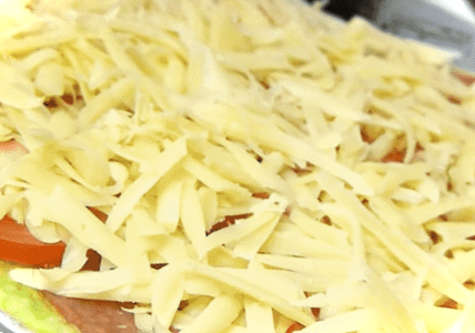 Зменшуємо вогонь до мінімуму, і відразу розкладаємо начинку: нарізані часточками помідор і ковбасу. Зверху присипаємо сиром натертим на тертці.