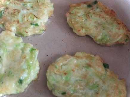Сковороду змащуємо олією і викладаємо на неї по одній ложці кабачкову масу.