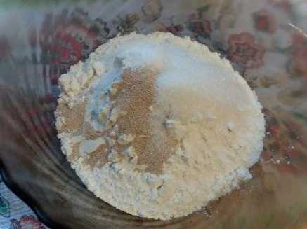 Крок 1. У глибоку чашку насипаємо борошно, додаємо до неї сіль, цукор та дріжджі, добре їх перемішуємо.
