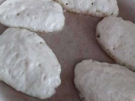 Випікають оладки, коли воно знову підійде та збільшиться у розмірі в 2-3 рази. Тісто викладають на добре прогріту сковороду ложкою, змоченою у воді, так тісто добре відокремлюватиметься від ложки. Жарять з обох боків до утворення рум'яної скоринки.