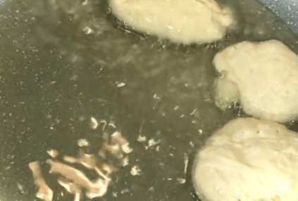 Крок 4. На сковороду наливаємо олію, добре її розігріваємо і ложкою, змоченою у воді або в олії, викладаємо тісто на сковороду і обсмажуємо в олії з обох боків.