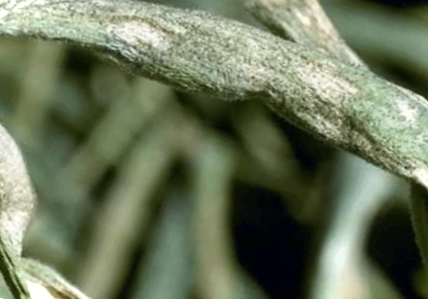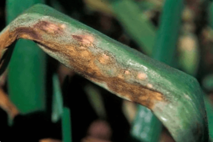 - Пізніше жовтизна поповзе вниз і перо покриється сірими спорами збудника. Наземна частина листя набуває сіро-фіолетового нальоту;