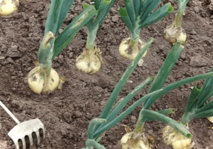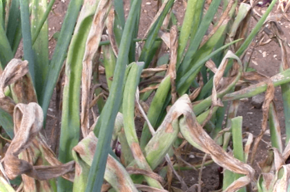 Як виглядає цибуля, уражена пероноспорозом, подивіться на фото.