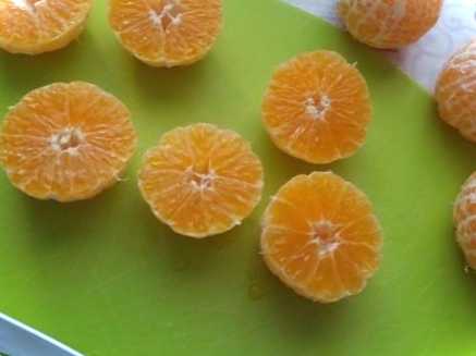 Очищаємо мандарини від шкірки. Шкірку не викидайте, вона вам, можливо, ще знадобиться. Цитруси розрізаємо гострим ножем на 2 половинки, поперек часточок.