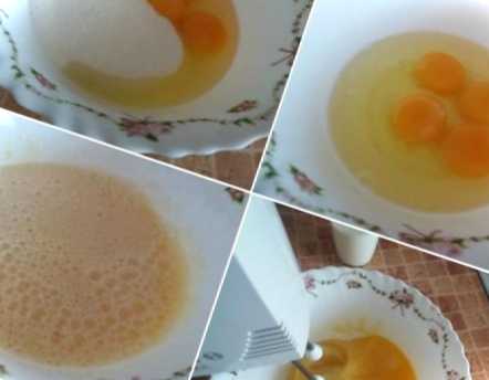Спочатку готуємо тісто для пирога. Для цього в глибоку миску розвиваємо яйця, додаємо до них цукор і збиваємо міксером до отримання пишної густої піни.