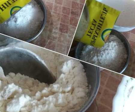 З'єднуємо разом борошно, розпушувач та ванільний цукор, перемішуємо ложкою, і через ситечко поступово додаємо в суміш, продовжуючи збивати тісто міксером. Готове тісто по консистенції має вийти, як не дуже густа сметана.