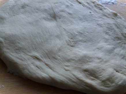 Тим часом тісто підійшло, дістаємо його з чаші та вивалюємо на обробну дошку. Так само чинимо, якщо його дістали з холодильника. Відразу ж вмикаємо духовку для розігріву, температуру встановлюємо 230-250ºС.
