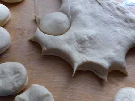 Тісто розподіляємо по обробній дошці товщиною 1,5-2 см і тонкою склянкою робимо кружки. Так свого часу мене навчила робити свекруха. Вирізати склянкою дуже зручно, тому що всі пиріжки виходять однакового розміру.