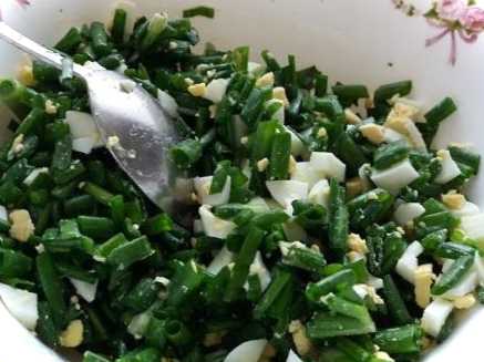 Дрібно нарізаємо зелену цибулю, складаємо у блюдо, трохи солимо, перемішуємо. Яйця очищаємо від шкаралупи, дрібно нарізаємо та відправляємо до зеленої цибулі, перемішуємо.