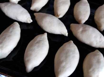 Краї обережно защипуємо, щоб не вивалилася начинка і зворотним боком укладаємо на змащений лист.
