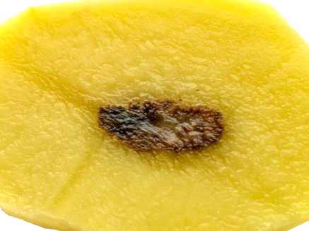 Картопля, яка при розрізі чорна всередині - це ознака неправильного зберігання овочів. Виникає внаслідок високих температур при зберіганні бульб або їх задушенні від нестачі кисню. Середня частина бульби зморщується, може тріскатися, в м'якоті бульби з'являються сірі або чорні плями. На поверхні можуть з'являтися мокрі ділянки.