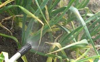 - Якщо зелень на часнику почала жовтіти, а зелень стає бляклою, це сигнал про те, що йому не вистачає харчування. Полийте під корінь рослини розчином нашатирного спирту, для цього 60 мл нашатирки розведіть у 10-літровому відрі, розмішайте і полийте під корінь із розрахунку по 200 мл розчину на одну рослину. Підживлення проводять за попередньо пролитим грунтом.