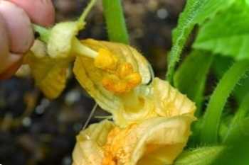 Запилюйте рослини вручну. М'яким пензликом зберіть пилок з чоловічої квітки, і перенесіть на жіночу. Можна зробити простіше. Зірвати чоловічу квітку, завернути назад або видалити пелюстки. Потріть жіночу квітку чоловічою. Сигналом про те, що ви все зробили правильно, стане в'янення жіночої квітки вже наступного дня. Тепер у ньому відпадає потреба. Рослина кидає сили на зростання плодів.