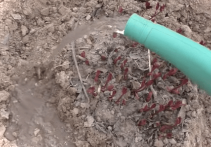 Потім рясно полийте багаторічник, виливши в борозенку кілька прийомів 3-4 відра води. Після того, як вода вбереться в ґрунт, налийте в борозенку з лійки розчин нітроамофоски. Як тільки рідина повністю вбереться, заробіть борозенку землею.