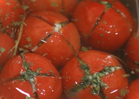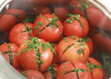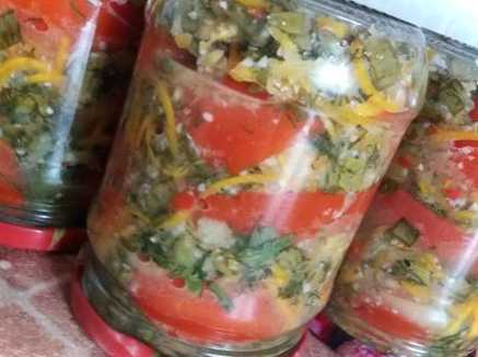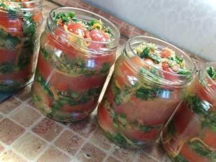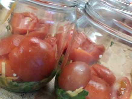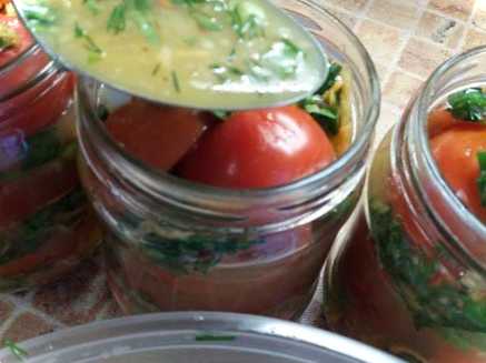 Для тих, хто хоче замаринувати помідори в такий спосіб на зиму, фаршировані плоди накладають у простерилізовані банки. Наповнені банки прикривають кришками прокип'яченими і стерилізують на повільному вогні 15-20 хвилин. Після банки закочують, перевертають і залишають повільно остигати під товстою ковдрою.