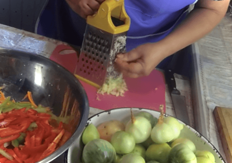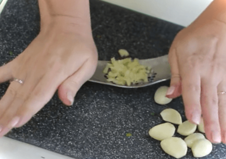 Крок 2. Очищені зубчики часнику натираємо на дрібній тертці. Можна його пропустити через часнику, або подрібнити в блендері. Відправляємо часник до овочів.