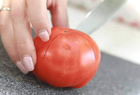 Крок 6. Беремо помідор і перевертаємо його вниз плодоніжкою. Робимо хрестоподібний надріз до середини плода.