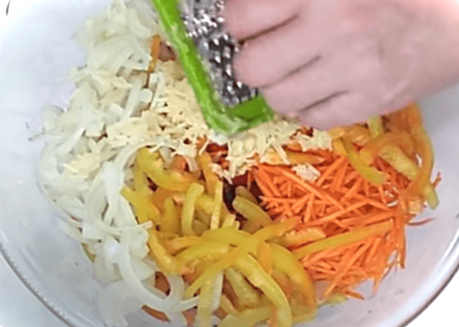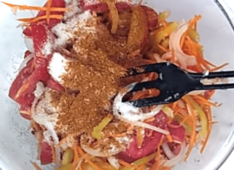 Крок 3. В овочеву суміш насипаємо сіль, цукор та корейську приправу, знову все перемішуємо.