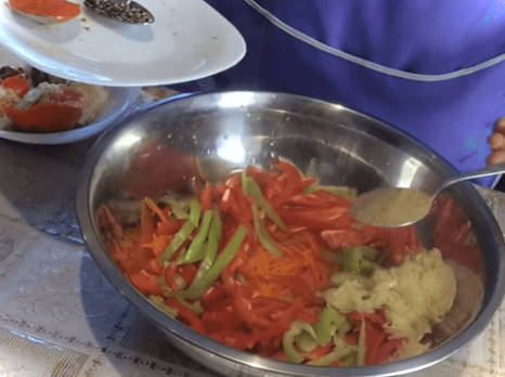 Крок 5. У середині овочів у тазу робимо невелике заглиблення і насипаємо туди коріандр, мелений перець та паприку.